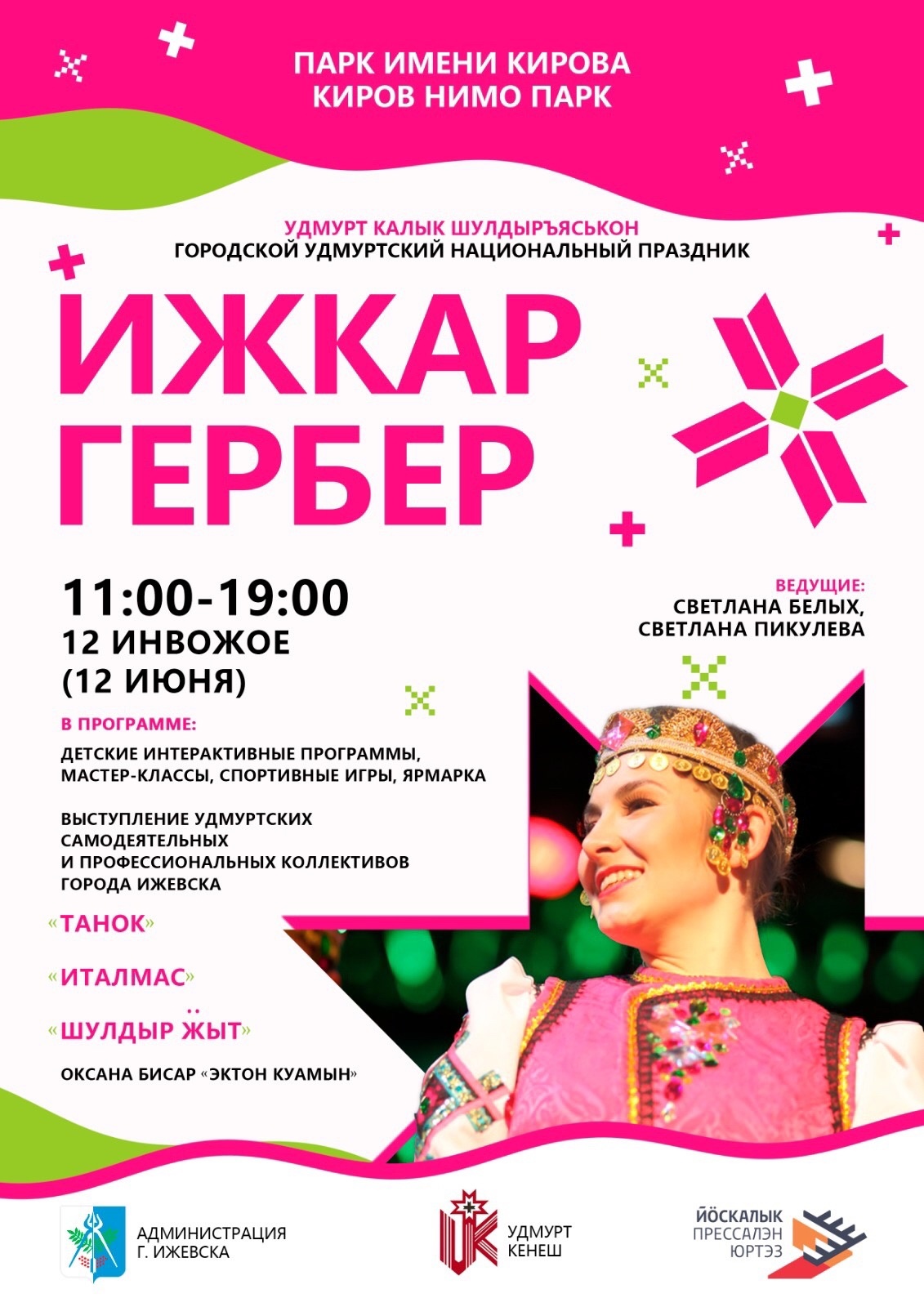 На сцене парка ожидается концертная программа коллективов из Ижевска. Планируется участие популярных ансамблей «Танок», «Италмас» и «Шулдыр Жыт». Дизайнеры продемонстрируют коллекции в стиле этно — современные и традиционные удмуртские платья. На площадке «Лыдӟы удмуртсэ/Читай родное» от республиканской общественно-политической газеты «Удмурт дунне» каждый желающий сможет насладиться удмуртской поэзией. Молодежная организация «Шунды» приглашает всех исполнить любимые песни под гитару и побывать на удмуртском стендапе. Также организаторы подготовили национальные игры, конкурсы и мастер-классы для участников всех возрастов.
