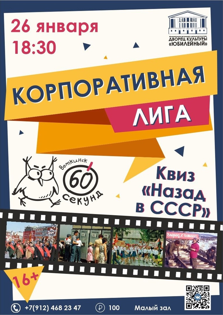 В ДК «Юбилейный» продолжается проект Корпоративная Лига «60 секунд». 26 января вместе организаторы предлагают вспомнить музыку, кино, события, литературу советской эпохи. Увлекательные вопросы, море положительных эмоций и неподдельный интерес участников – самый скромный список преимуществ такого формата развлечений. Принять участие в играх Корпоративная Лига «60 секунд» приглашаются команды предприятий, учреждений, организаций г. Воткинска. Заявки на участие принимаются через мессенджеры (WhatsApp, Viber) по номеру: +7 912 468 23 47, Сергей Комлев. ДК"Юбилейный" 26 января в 18.30 Стоимость билета 100 рублей ДОСТУПНА ОПЛАТА ОНЛАЙН