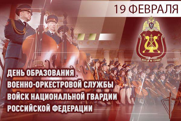 19 февраля в войсках национальной гвардии Российской Федерации отмечается день создания военно-оркестровой службы ведомства. Военная музыка во все времена служила средством военного управления, строевого обучения и воинского воспитания, а военные оркестры являлись эффективным инструментом поднятия боевого духа личного состава и формирования патриотических настроений, одним из символов Российской армии и культуры, хранителями традиций русского воинства и государства. В войсках правопорядка военные оркестры впервые упоминаются в 1921 году, когда было утверждено Положение о военных оркестрах войск ВЧК.