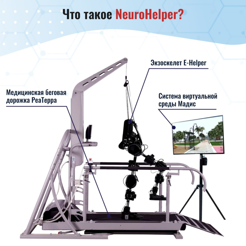 Установка состоит из трех элементов, один из которых – экзоскелет нижних конечностей E-Helper со встроенной системой функциональной электростимуляции мышц и электромиографии. Данная разработка была поддержана Фондом содействия инновациям в рамках конкурса «Развитие-НТИ» и успешно синхронизирована с другими компонентами комплекса Neuro-Helper: системой виртуальной среды «Мадис» и специальной версией медицинской беговой дорожки PeaTeppa.