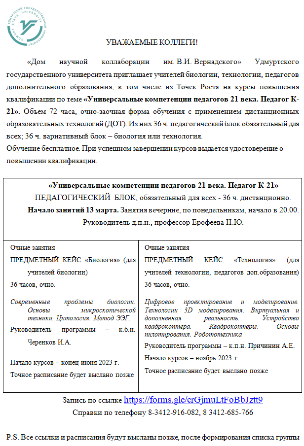 «Дом научной коллаборации им. В.И. Вернадского» приглашает педагогов на курсы повышения квалификации по программе «Универсальные компетенции педагогов 21 века. Педагог К-21» (для учителей биологии и технологии). Обучение бесплатное. Запись по ссылке forms.gle/crGjmuLtFoBbJztt9