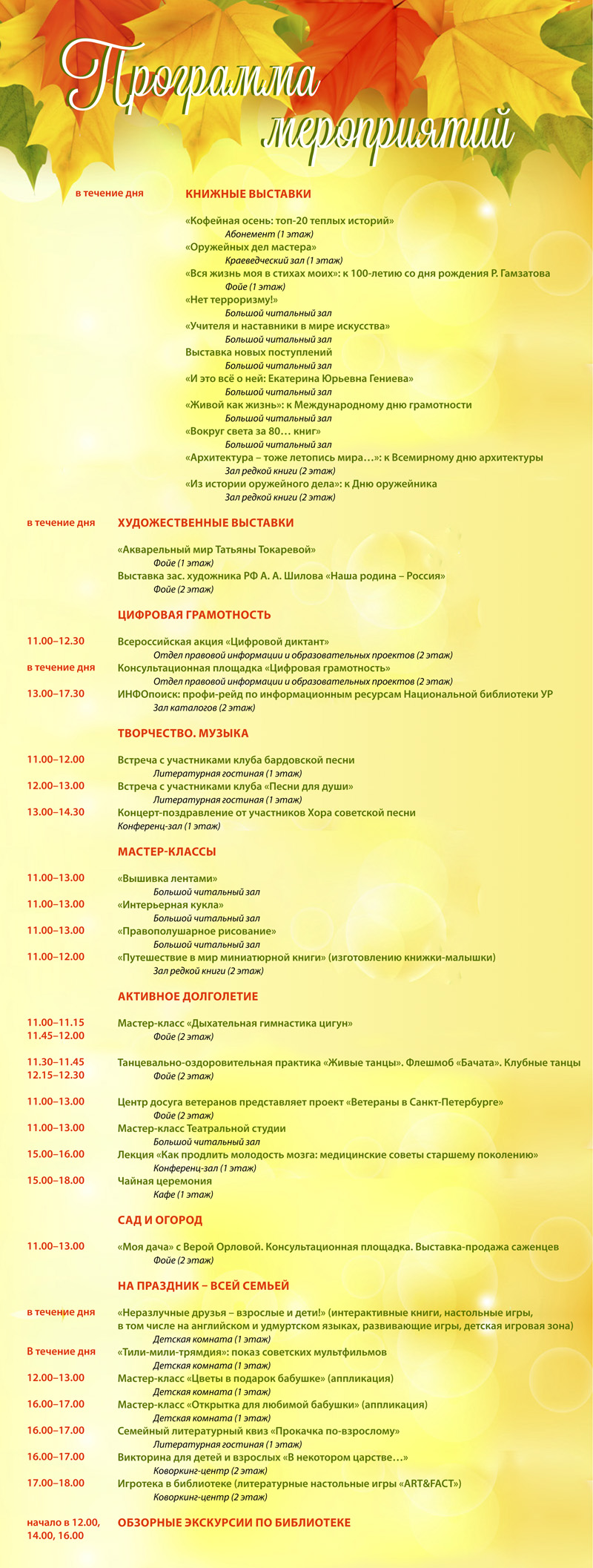 1 октября Национальная библиотека УР в партнерстве с Советом ветеранов работников культуры и искусства при Министерстве культуры УР проводит Праздник старшего поколения . В течение всего дня его участники смогут найти для себя много полезных и увлекательных занятий. Приходите с друзьями, соседями, родственниками, приходите всей семьей!