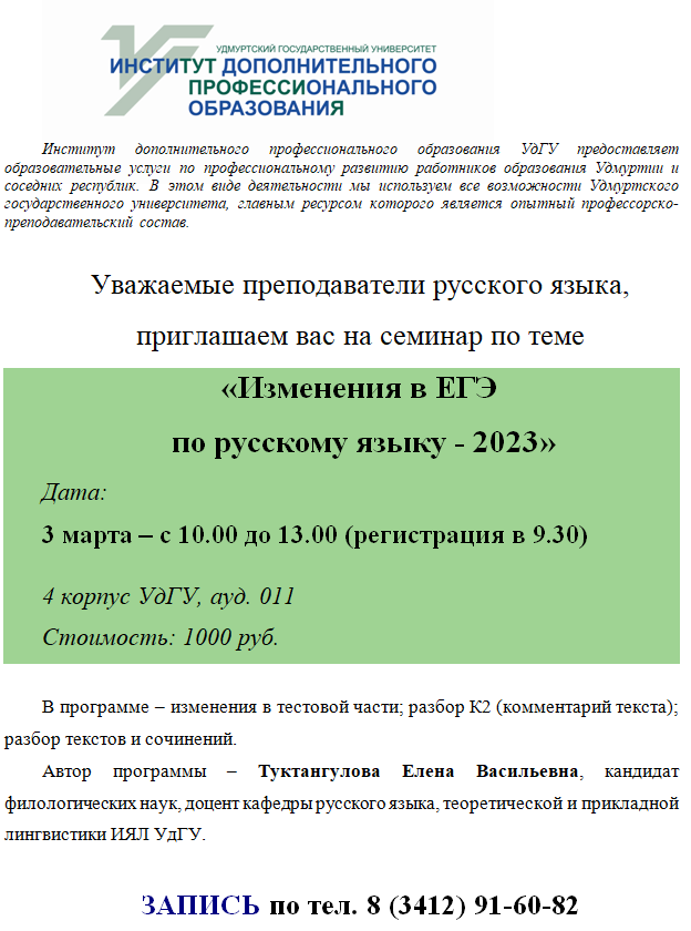 Институт дополнительного профессионального образования приглашает учителей русского языка на семинар «Изменения в ЕГЭ по русскому языку-2023», который состоится 3 марта. Лектор – Туктангулова Елена Васильевна, кандидат филологических наук, доцент кафедры русского языка, теоретической и прикладной лингвистики ИЯЛ УдГУ.