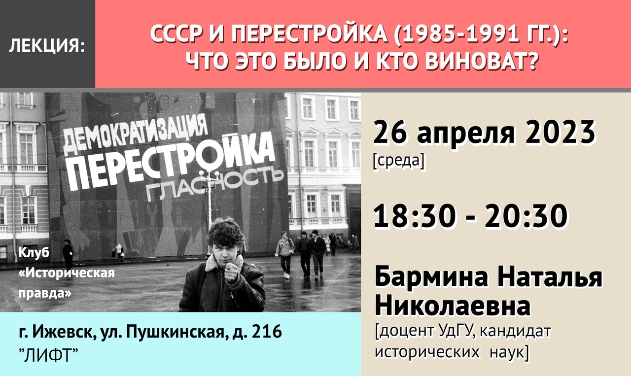 26 апреля 2023 года (среда) в Штабе Городских Проектов "ЛИФТ" по адресу г. Ижевск, ул. Пушкинская, 216 состоится лекция Натальи Николаевны Барминой по отечественной истории с дальнейшим обсуждением и дискуссией "СССР и перестройка..."