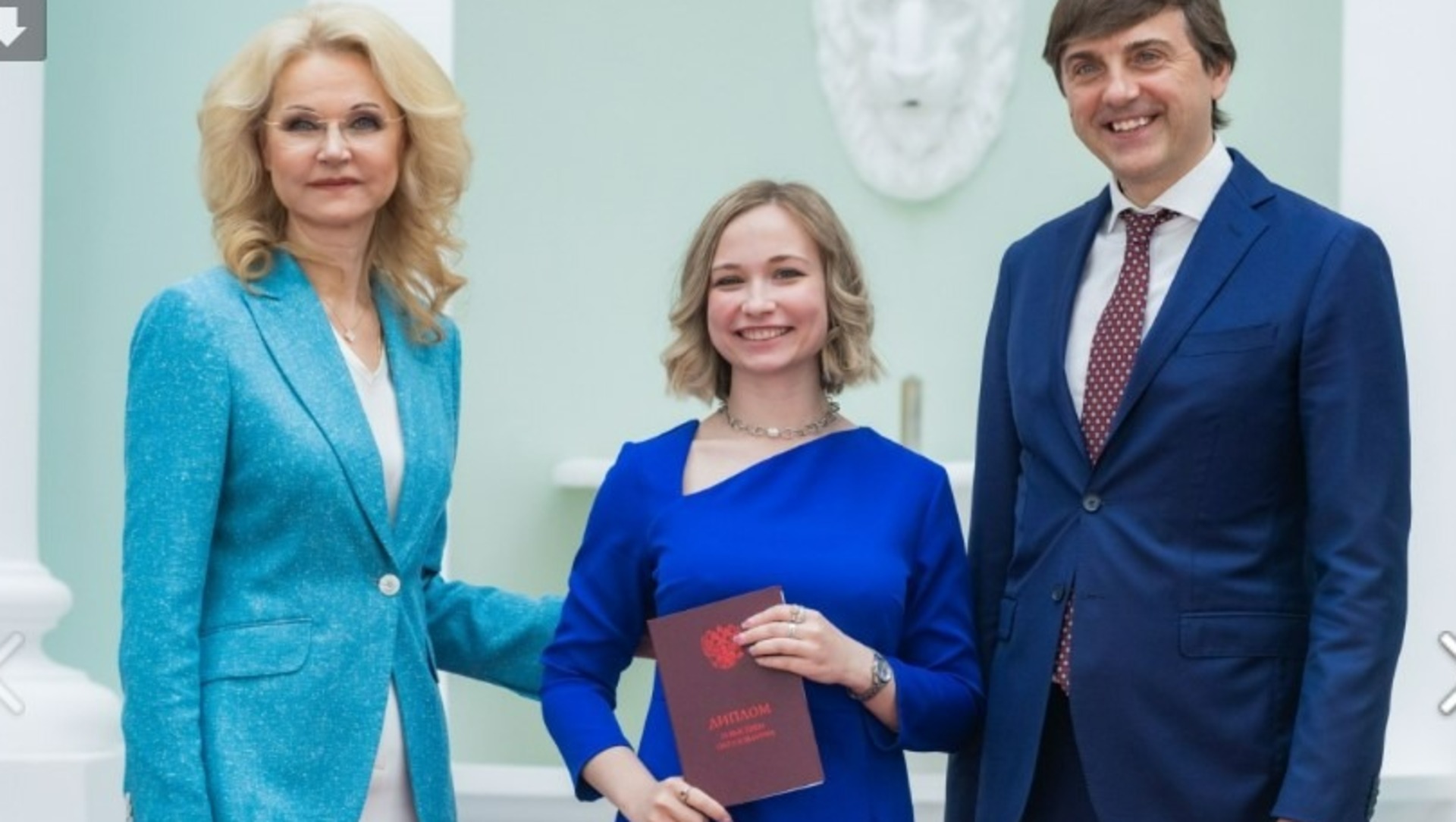 Диплом с отличием в Год педагога и наставника девушка получила из рук заместителя Председателя Правительства России Татьяны Голиковой и министра просвещения страны Сергея Кравцова.