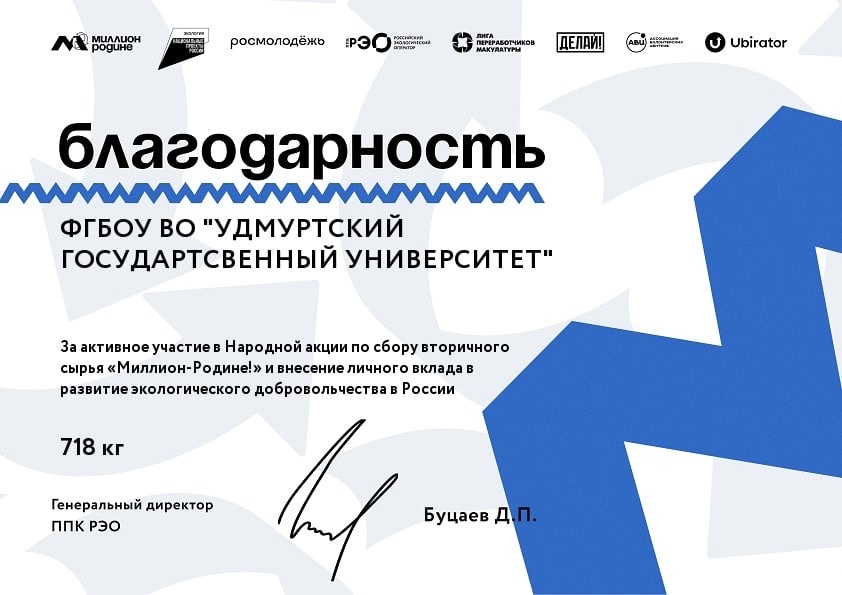 Удмуртский государственный университет получил благодарность за участие в Народной акции по сбору вторничного сырья «Миллион — Родине!» и получил благодарность за внисение личного вклада в развитие экологического добровольчества в России.