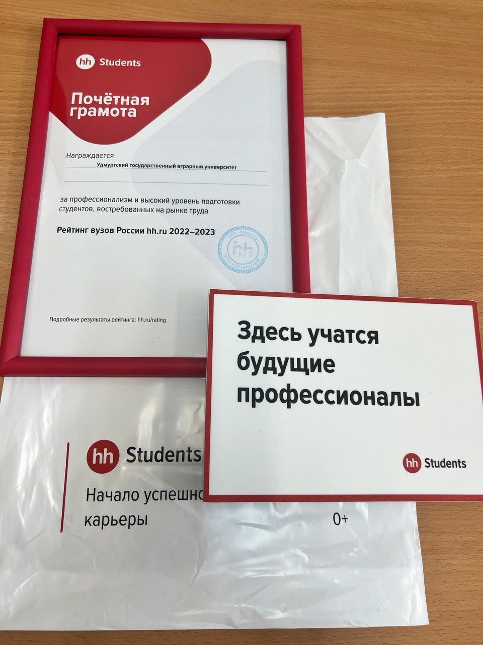 «Руководство УдГАУ получило от сайта HeadHanter почетную грамоту и благодарственное письмо. «Поздравляем ваш вуз с победой! Вы стали финалистом Рейтинга лучших вузов России по версии hh.ru 2022-2023 года.