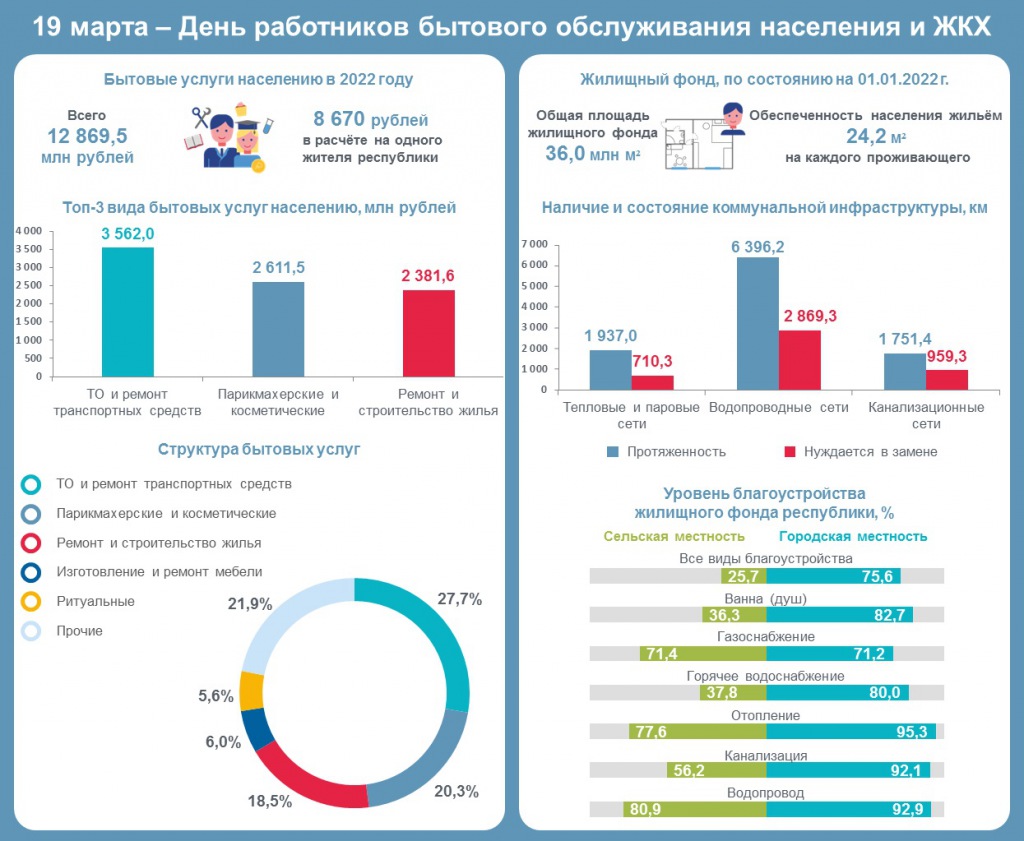 Несмотря на то, что объем средств, выделяемых из консолидированного бюджета республики, на развитие и модернизацию жилищно-коммунального хозяйства с каждым годом растет, а в 2022 году на эти цели направлено почти 6,3 млрд рублей (5,2% всех расходов), кардинально изменить ситуацию в этой сфере деятельности пока не удается.