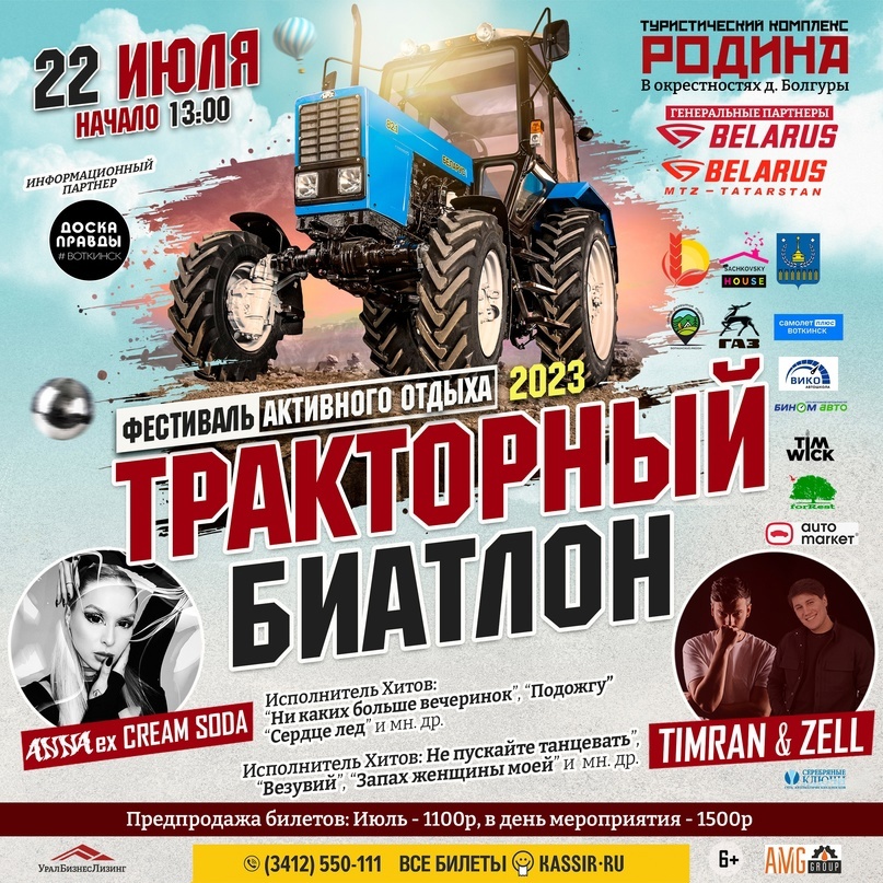 Можно отправиться на Тракторный Биатлон Уже завтра, 22 июля, фестиваль соберёт тысячи гостей в ТК " Родина", расположенном вблизи д. Болгуры. В этом году «Тракторный Биатлон» получил статус Международного мероприятия. Соревнования на тракторах пройдут на трассе длиной 1,5 км. Правила состязания схожи с классическим биатлоном. Участники должны на скорость преодолеть трассу с различными препятствиями и огневыми рубежами. Причём участвуют не только мужчины, но и представительницы прекрасного пола. Кроме того, на празднике состоится презентация новейшей сельскохозяйственной техники, будут организованы интерактивные, развлекательные, спортивные площадки, дегустация блюд национальной кухни, концертная и танцевальная программы. Все желающие смогут подняться в небо на воздушном шаре и взглянуть на красоты нашего района с высоты птичьего полёта. Все подробности о фестивале можно узнать в официальной группе Тракторный Биатлон Сохраняйте программу праздника, и будьте в центре самых интересных событий! Источник информации: https://vk.com/movotray?w=wall-154794066_10413