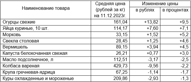 За период с 5 по 11 декабря 2023 года на потребительском рынке Удмуртии зафиксированы наиболее существенные изменения средних цен на следующие продовольственные товары: