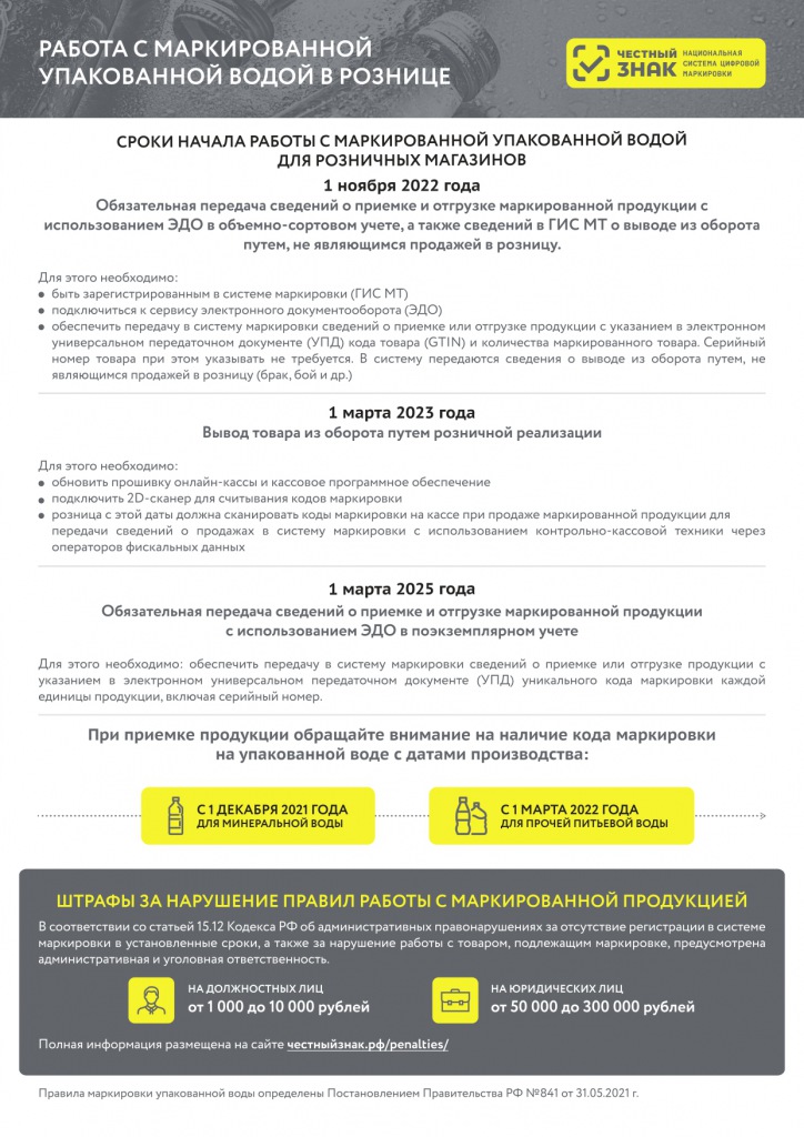 Информируем, что в соответствии с постановлением Правительства Российской Федерации от 31 мая 2021 г. № 841 «Об утверждении Правил маркировки упакованной воды средствами идентификации и особенностях внедрения государственной информационной системы мониторинга за оборотом товаров, подлежащих обязательной маркировке средствами идентификации, в отношении упакованной воды» (далее – Постановление, информационная система мониторинга) с 1 марта 2023 года вступают в силу требования о предоставлении информационную систему сведений о выводе из оборота упакованной воды путем розничной продажи.