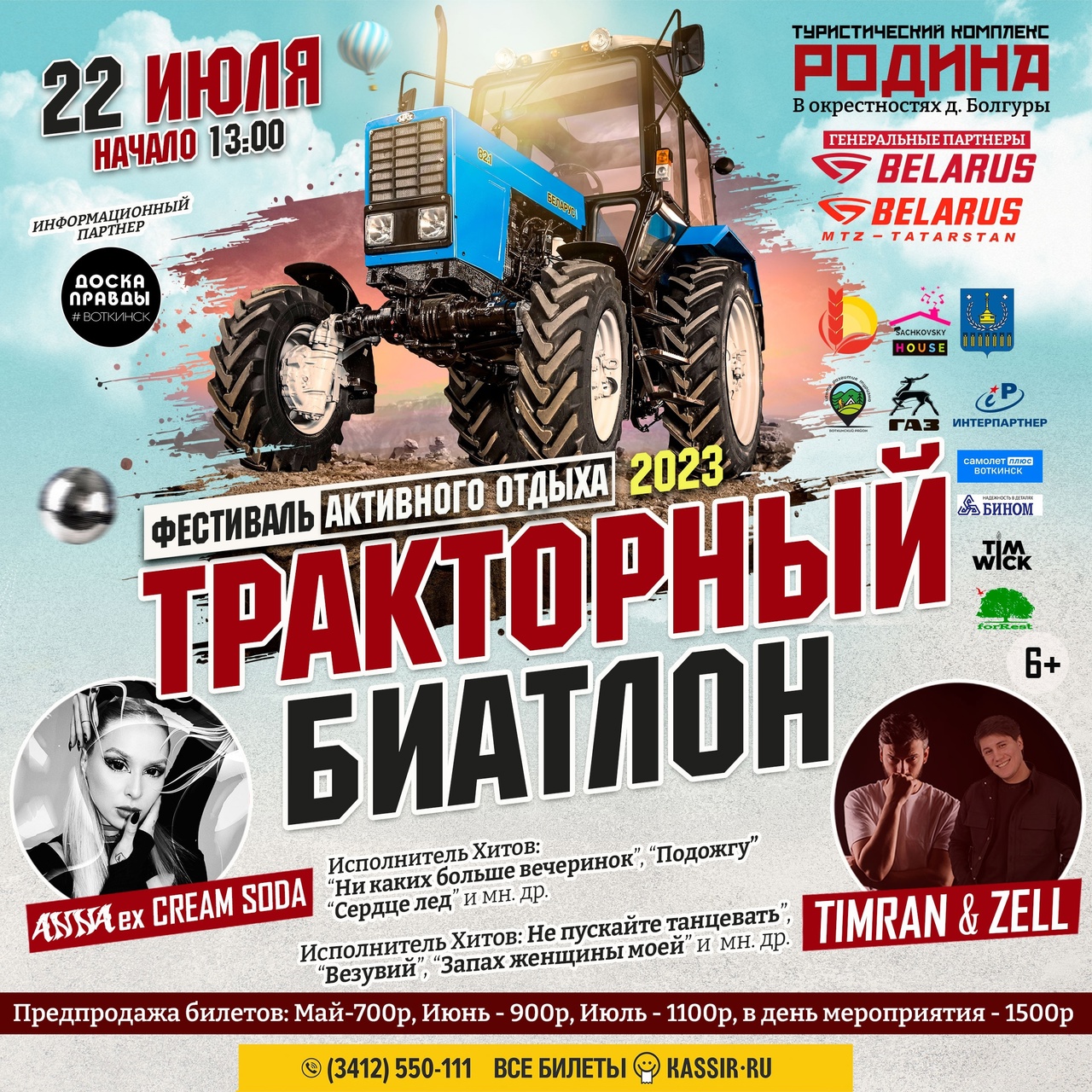 22 июля в Воткинском районе пройдет Фестиваль активного отдыха Тракторный биатлон. Организаторы спешат порадовать хорошими новостями: впервые в Воткинске выступят 4NN4 Ex CREM SODA Исполнители хитов "Ни каких больше вечеринок", "Подожгу" и мн.др, а также Timran & Zell Автор и исполнитель хитов "Запах женщины моей", "Не пускайте танцевать", "Везувий" и мн. др. Помимо этого на фестивале активного отдыха вас ждут: - Гонки на тракторах с элементами биатлона
