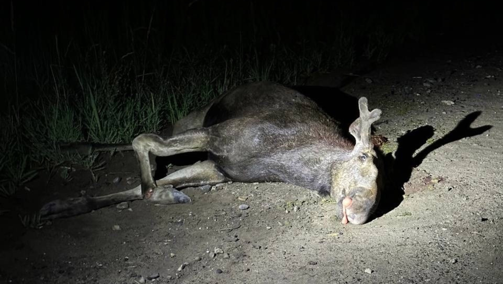 Проезжавшие мимо автолюбители увидели, что на обочине дороги лежит мертвый лось. Судя по размерам, это молодое животное.
