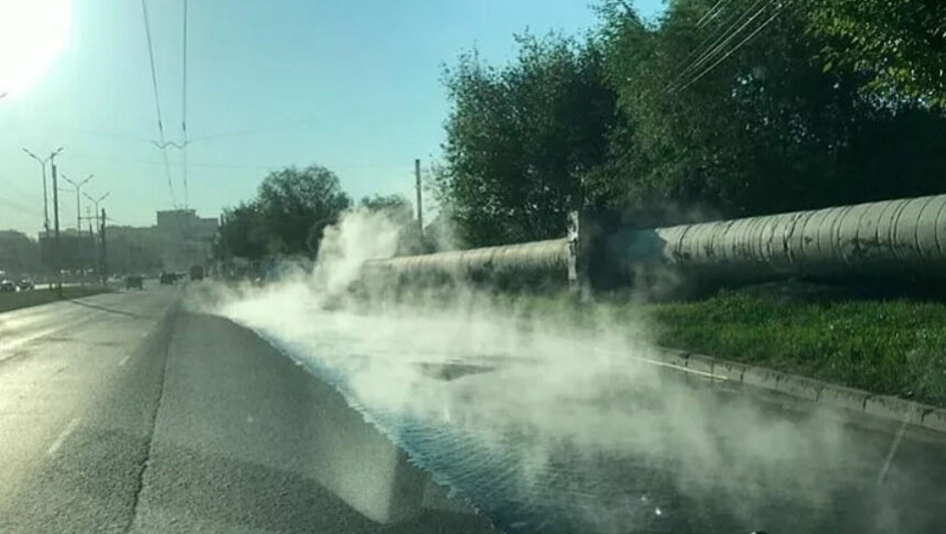 По словам ижевчан, поток кипятка бежит по проезжей части дороги, залита первая полоса дороги.