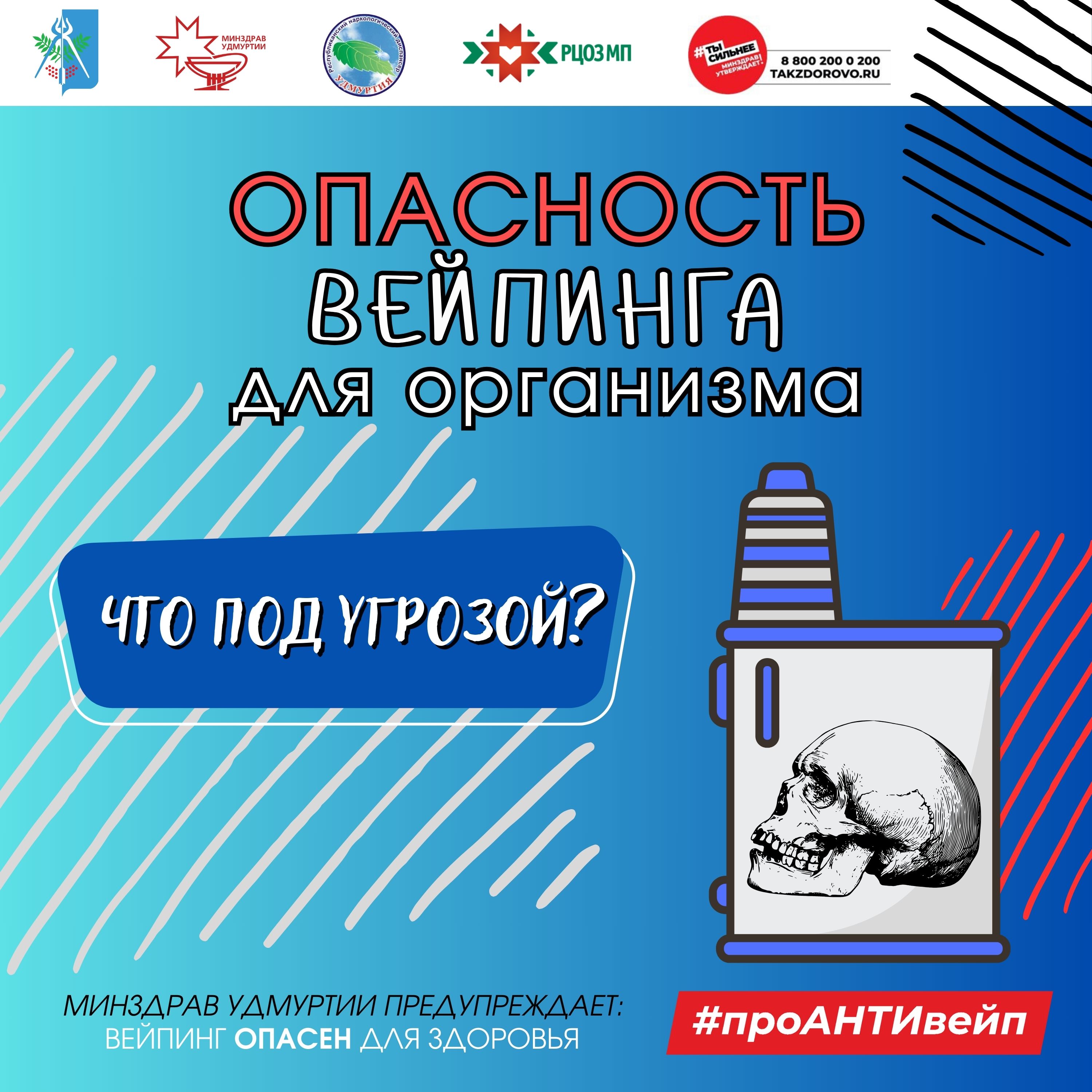 Проблема молодого поколения – вейпы. В организм вейпера попадает масса опасных веществ – акролеин, диацетил, глицерин, никель и другие тяжелые металлы, оседающие в организме. При курении вейпа вдыхается продукт распада глицерина и пропиленгликоля – газ формальдегид, который является сильнейшим нейротоксином, поражающим нервную систему. Известно около 15 тысяч ароматизаторов и вкусовых вариаций вейпов, каждый из которых по-своему потенциально вреден для организма.