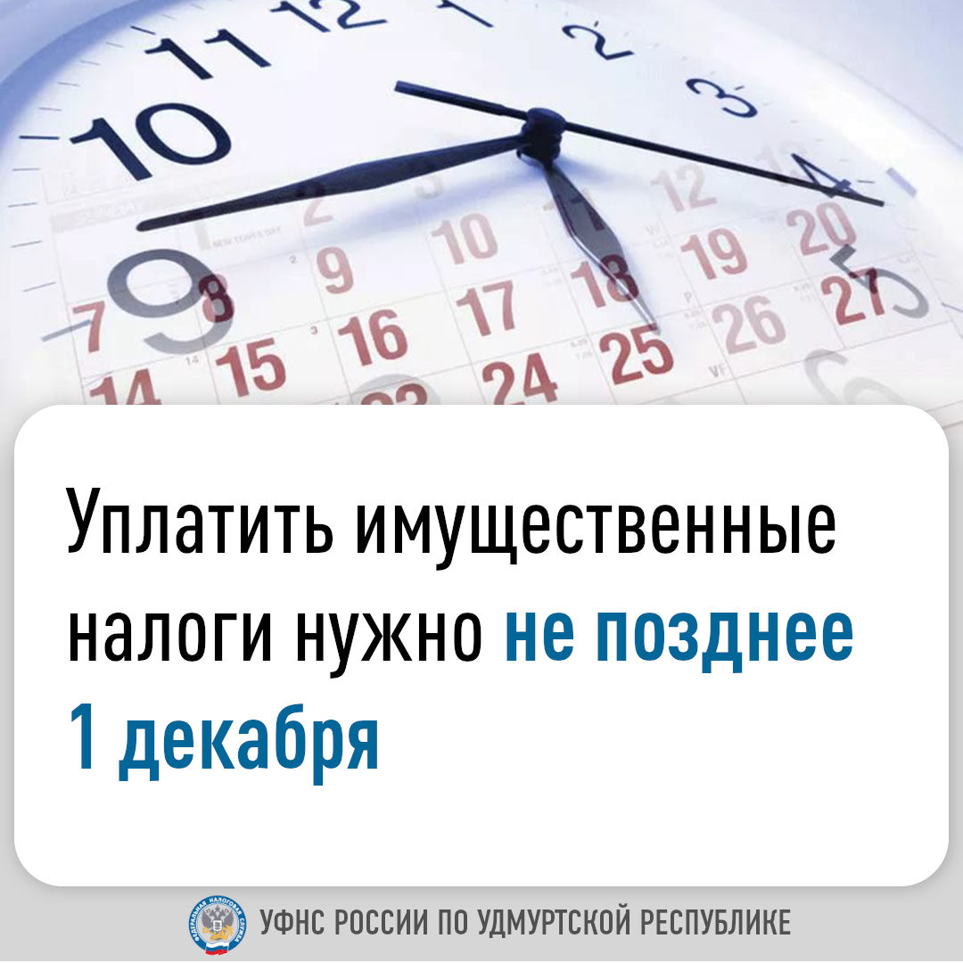 Управление Федеральной налоговой службы по Удмуртской Республике напоминает, что до 1 декабря 2023 включительно необходимо уплатить имущественные налоги физических лиц.