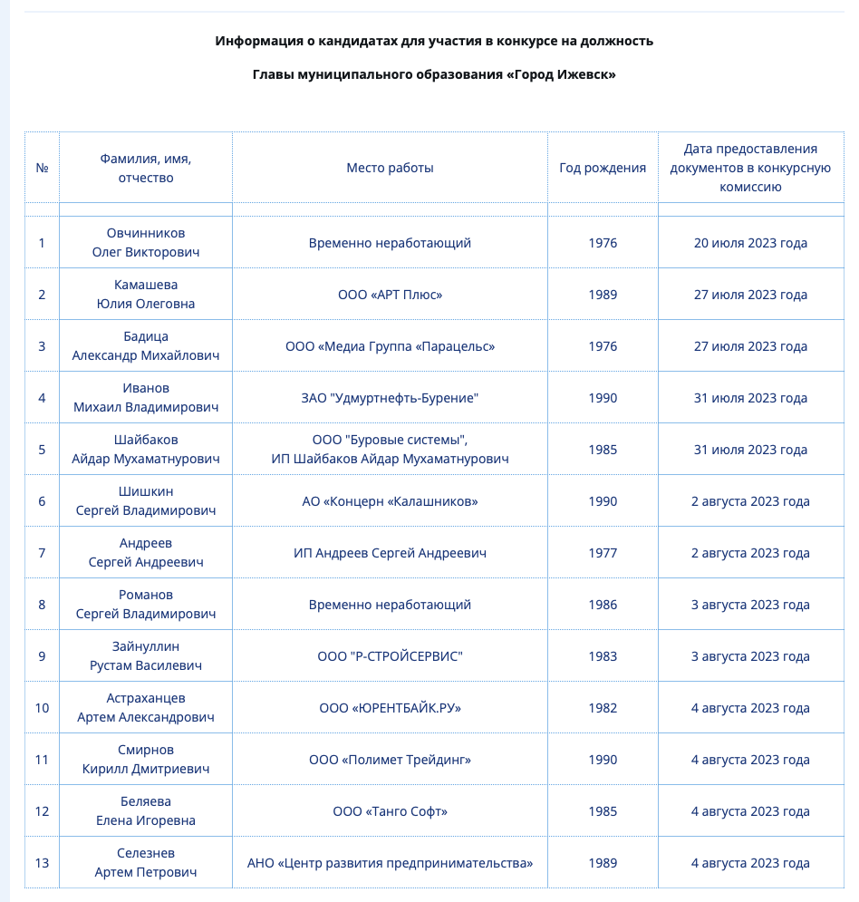 Список кандидатов на должность Главы города Ижевска Фото: izh.ru