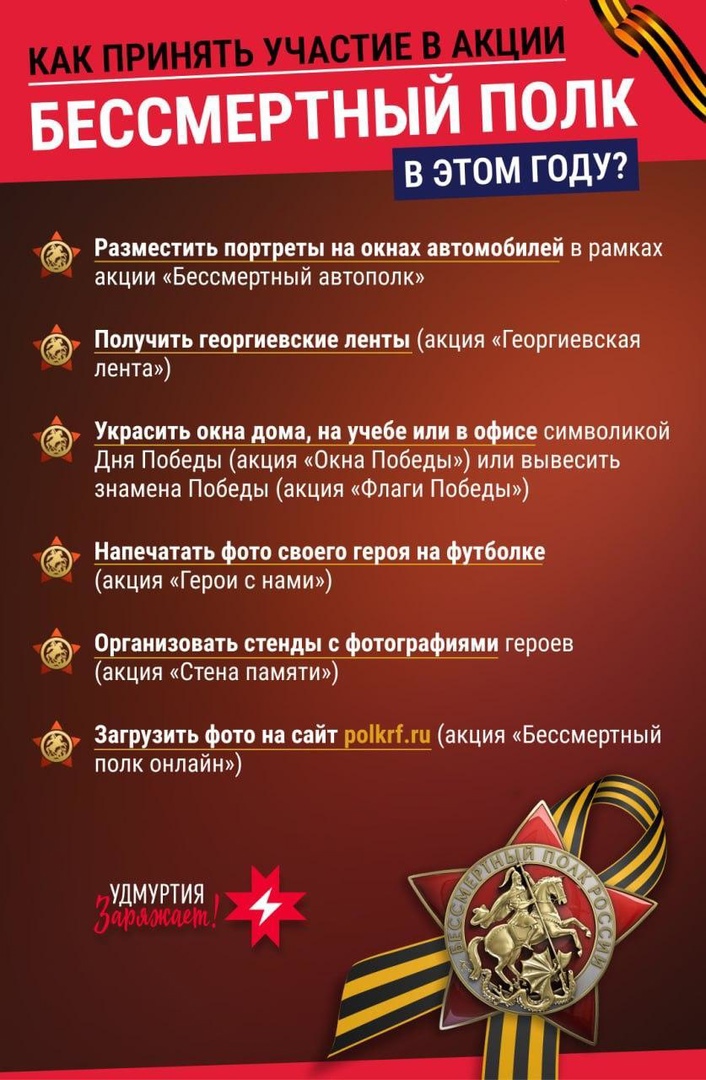 В этом году в Удмуртии решили отказаться от проведения «Бессмертного полка» в привычном формате. Организаторы предложили выйти за границы одной улицы, площади или набережной и разработали целый ряд форматов, которые может реализовать каждый. Подробности - в карточке. Источник информации: https://vk.com/movotray?w=wall-154794066_9946