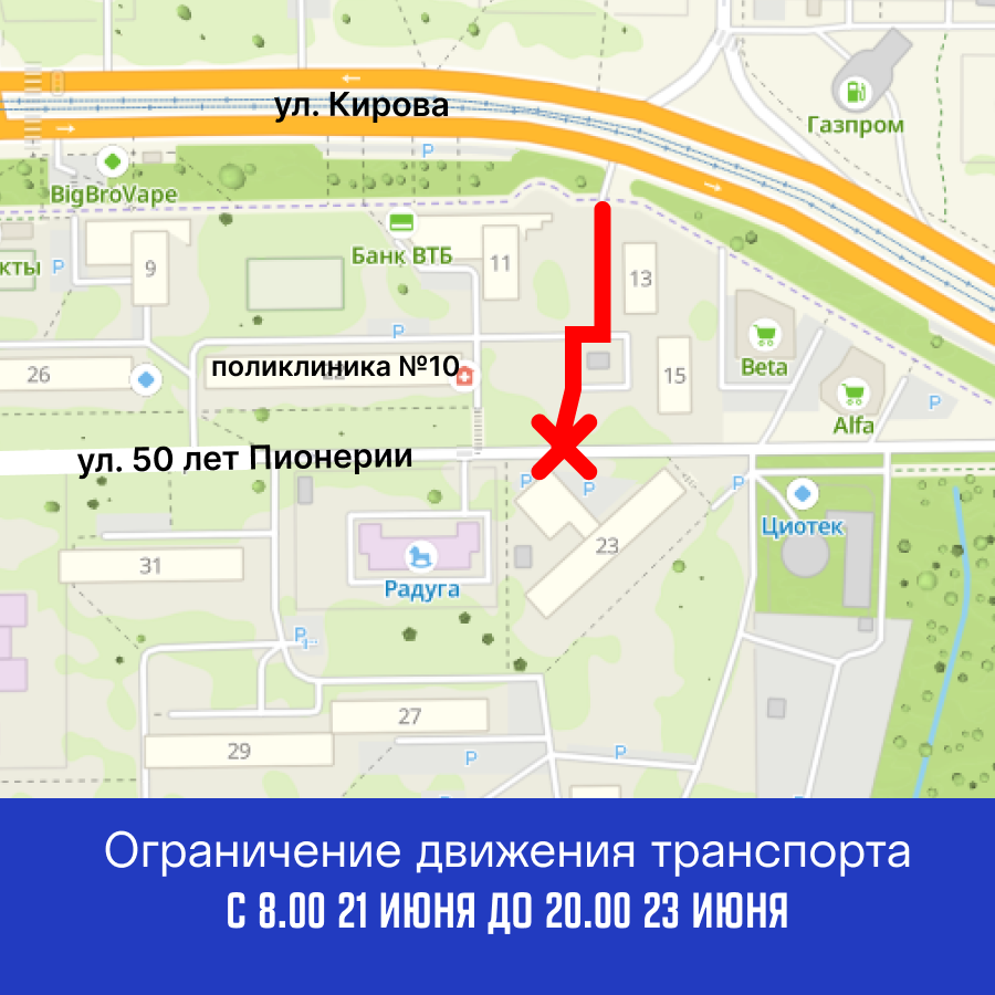 С 8.00 21 июня до 20.00 23 июня будет ограничено движение транспорта по ул. 50 лет Пионерии в районе поликлиники №10 и по межквартальному проезду от ул. 50 лет Пионерии до ул. Кирова, 13.