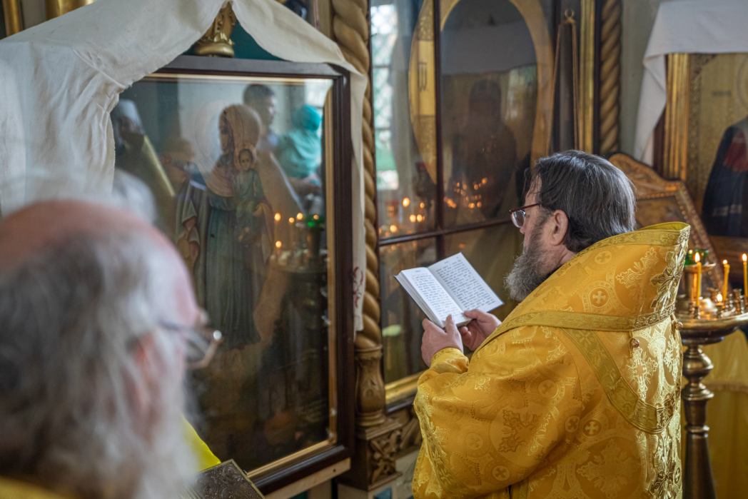 После литургии был совершен молебен Божией Матери перед хранящейся в этом храме Августовской иконой Божией Матери. У почитаемого образа архипастырь вознес молитвы о российском воинстве, сражающемся на поле брани.