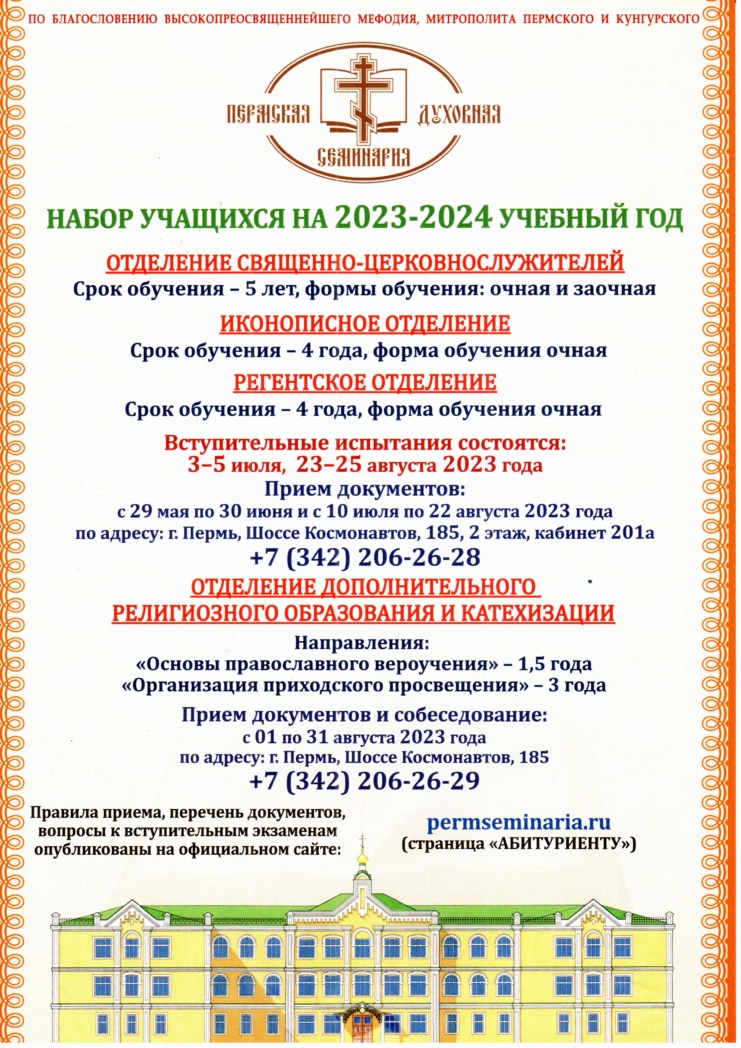 Пермская духовная семинария объявляет набор учащихся на новый учебный год