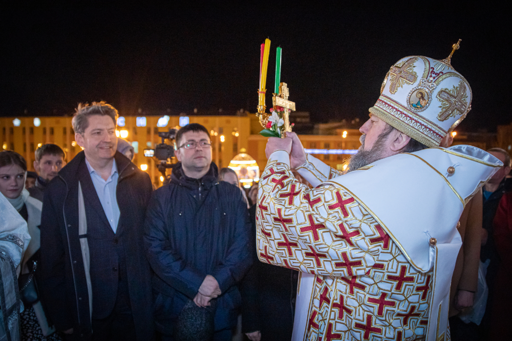 За литургией было зачитано Пасхальное послание Святейшего Патриарха Московского и всея Руси Кирилла , а в конце богослужения совершено традиционное освящение пасхального хлеба — артоса, который в субботу Светлой Седмицы будет роздан верующим.