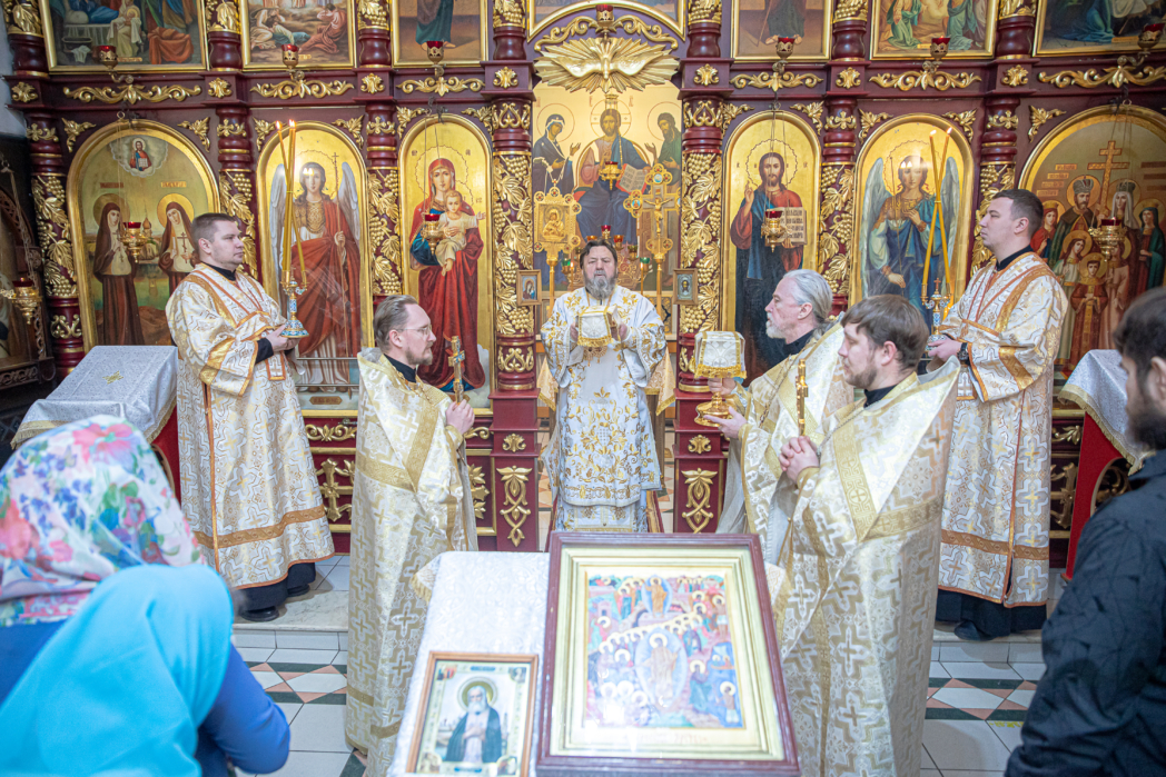 Владыке сослужили настоятель храма протоиерей Сергий Шерман, секретарь епархии диакон Илья Медведев и клирики прихода.