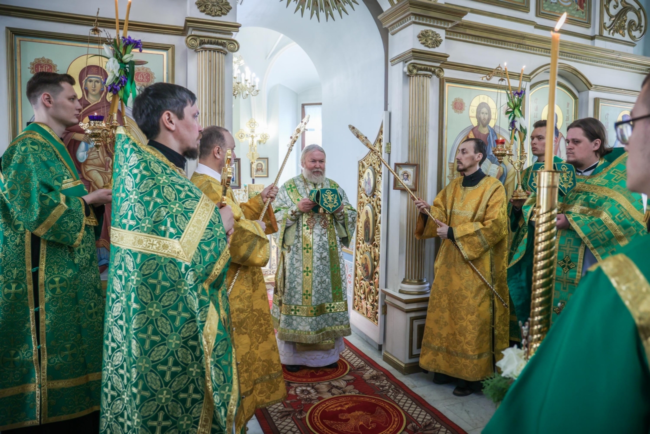 За праздничным богослужением Его Преосвященству сослужили: секретарь епархии священник Димитрий Сырчин, духовенство собора, а также клирик Воскресенского храма диакон Герман Остроумов.