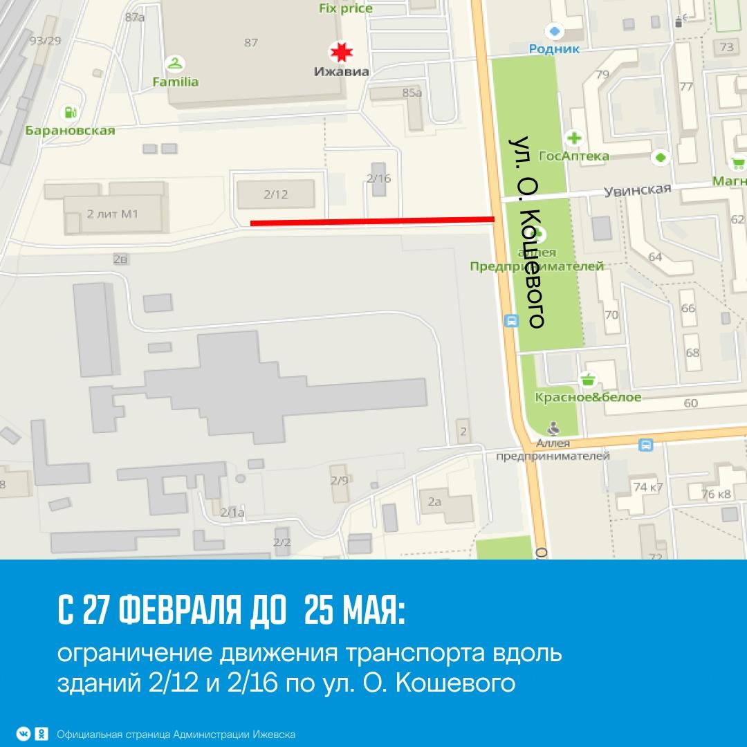По информации администрации Ижевска, 27 февраля по 27 мая движение транспорта по улице Олега Кошевого вдоль зданий 2/12 и 2/16 будет ограничено.