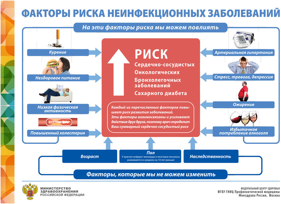 50% вклада в развитие ХНИЗ вносят основные 7 факторов риска: курение, нерациональное питание, низкая физическая активность, избыточное потребление алкоголя, повышенный уровень артериального давления, повышенный уровень холестерина в крови, ожирение.