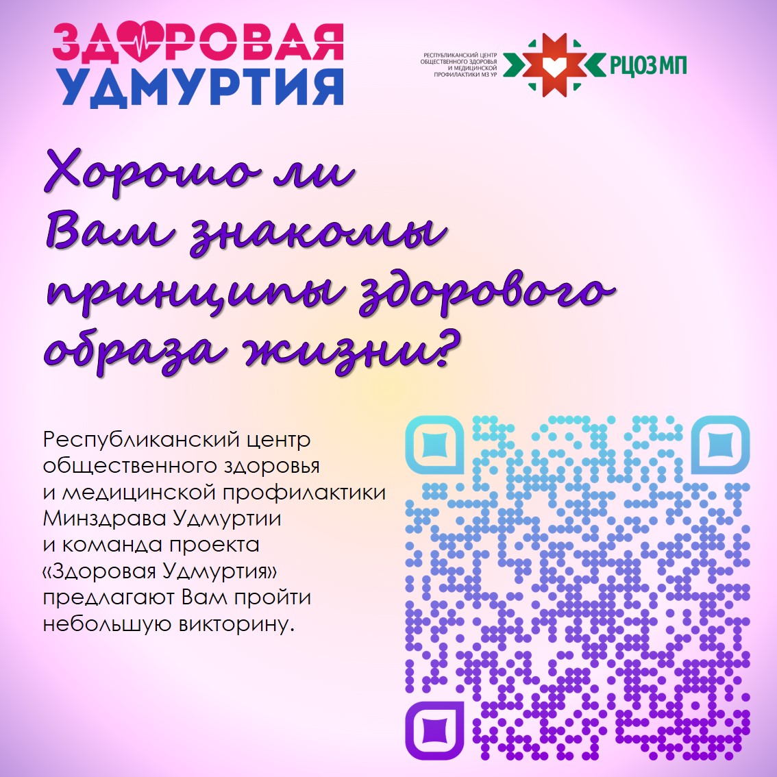 Друзья! Как думаете, хорошо ли вам знакомы принципы здорового образа жизни (ЗОЖ)? Сколько нужно потреблять овощей и фруктов в день? Так ли на самом деле вредны вредные привычки? Какие существуют здоровые способы борьбы со стрессом? Ответы на эти и другие вопросы о ЗОЖ вы получите, приняв участие в небольшой онлайн-викторине «10 вопросов и ответов про здоровье» по ссылке: