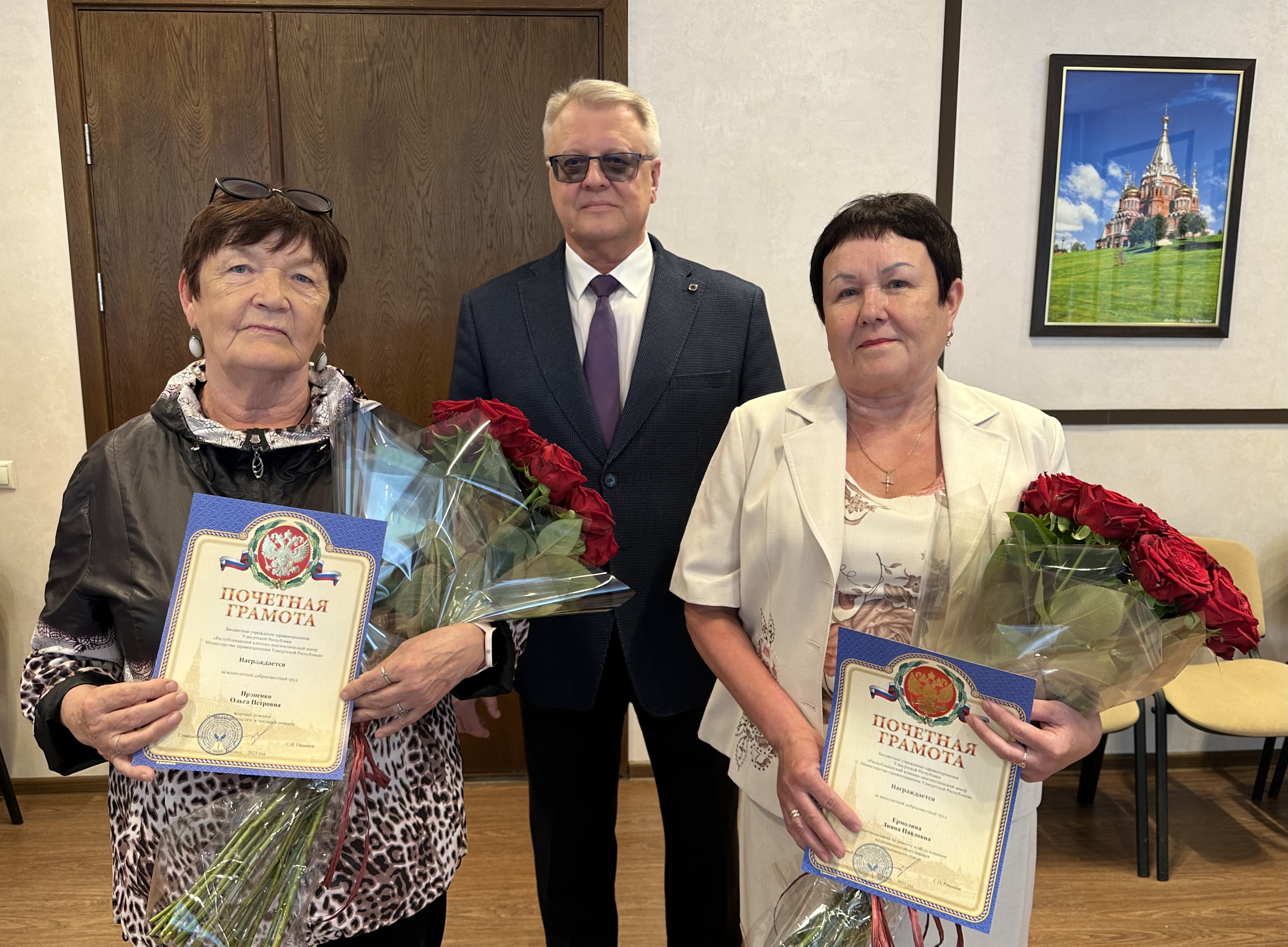 Главный врач Сергей Николаевич Рящиков сердечно поблагодарил Лияну Павловну и Ольгу Петровну за многолетний добросовестный труд и вручил им Почетные грамоты, цветы и памятные подарки.