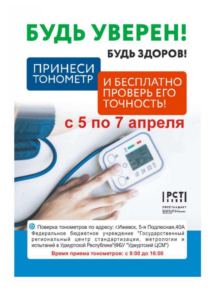 В дни акции специалисты ФБУ «Удмуртский ЦСМ» Росстандарта на безвозмездной основе будут вести прием граждан для проведения контроля выходных параметров бытовых тонометров артериального давления, используемых населением, по адресу: г.Ижевск, ул.5-ая Подлесная, 40-а, с 9-00 до 16-00ч