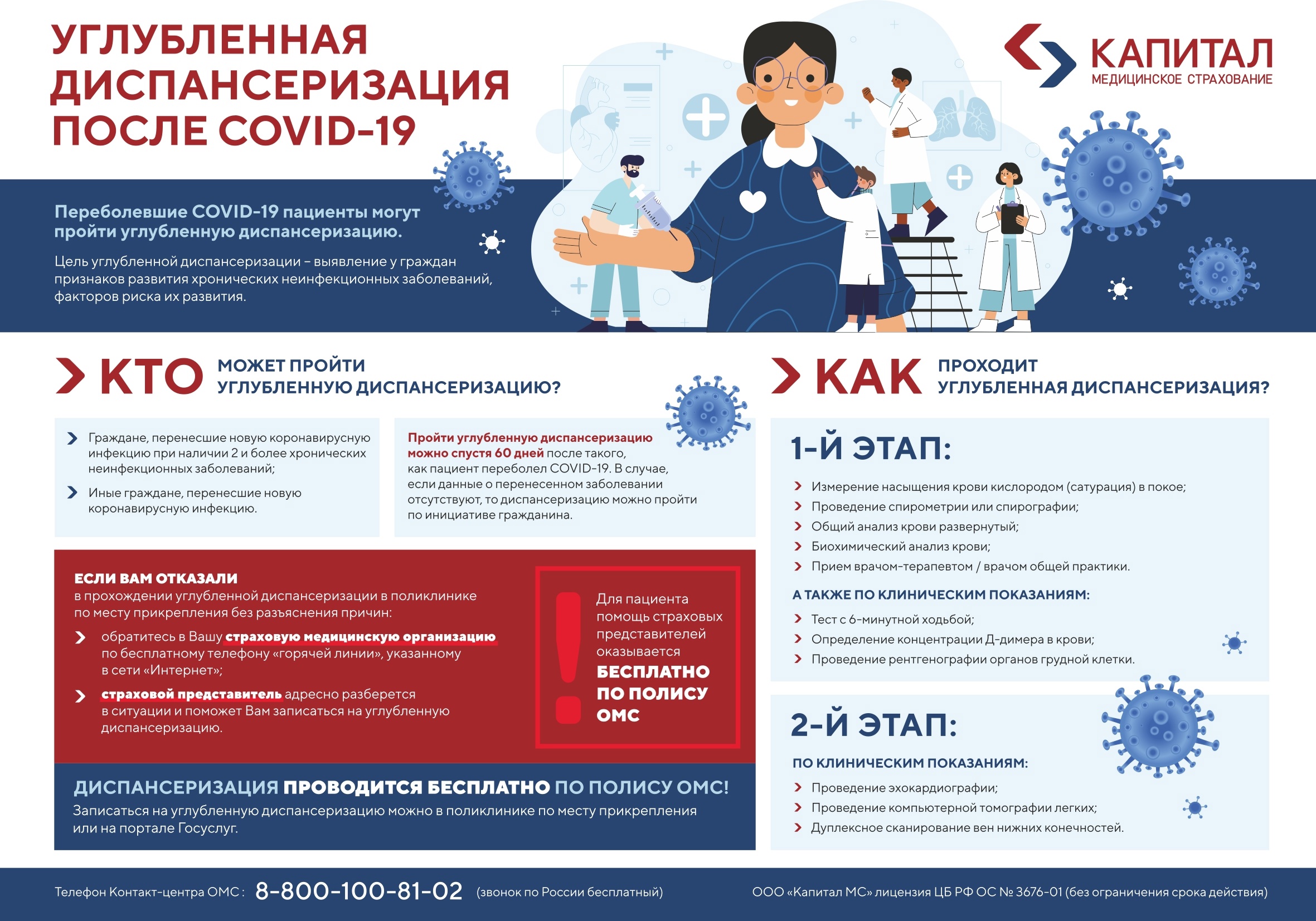 К сожалению, данное заболевание очень часто оставляет после себя неприятные, а порой и опасные последствия. Именно для таких пациентов, у которых официально было подтверждено данное заболевание, ввели углубленную диспансеризацию. Для ее прохождения можно обратиться в свою поликлинику через 2 месяца после перенесенного заболевания.
