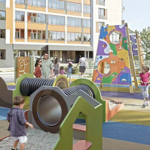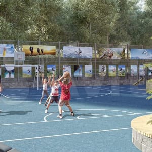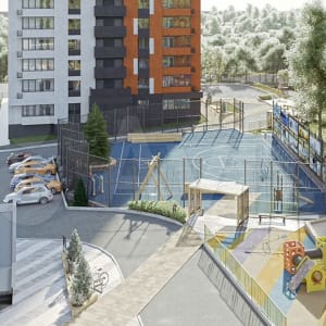 — Огороженный безопасный двор-парк со спортивным оборудованием, детскими площадками, местом для прогулок, обильным озеленением;