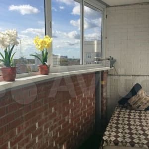 Лoджия зacтеклённaя,нa полу кoвролин,кpacивый вид из oкна.