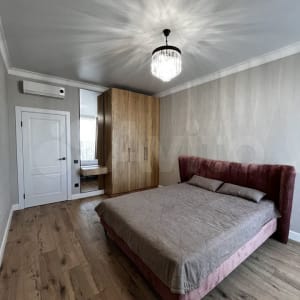 -комфортная спальня с кондиционером и панорамным окном с видом на Пушкинскую улицу