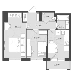 - Площадь кухни: 9.5 м²
