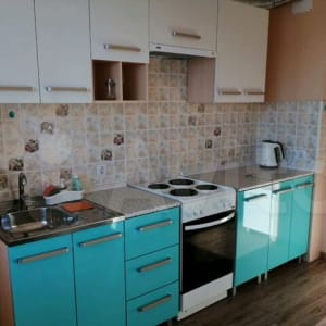 Оборудованая кухня с техникой(СВЧ, чайник, электро плита, холодильник) , посудой, столовыми приборами.