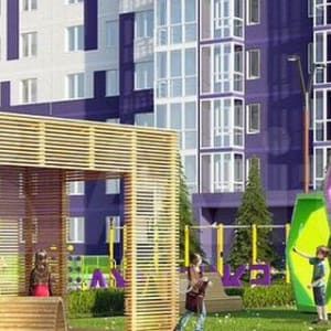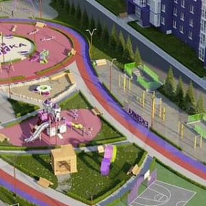 Ландшафтный дизайн во дворе, современная детская площадка и зона отдыха для взрослых.