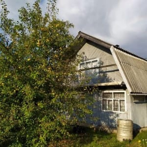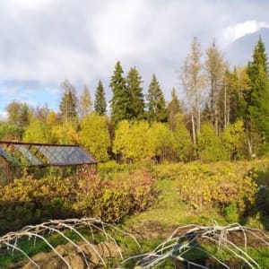 Плодоносные яблони, кусты смородины. За участком- лес.